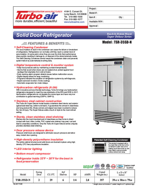 Turbo AirTurbo Air PRO-15R-G-N(-L) PRO Series Refrigerator Reach-in One-section Turbo Air's PRO Series Refrigerator is not only durable and efficient, but a...