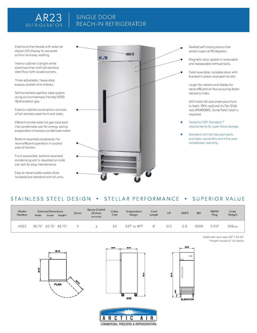 Arctic AirLoaded with easy-to-use features, the Arctic Air AR23 one section 23 cu. ft. reach-in refrigerator is the perfect addition to your commercial kitch...