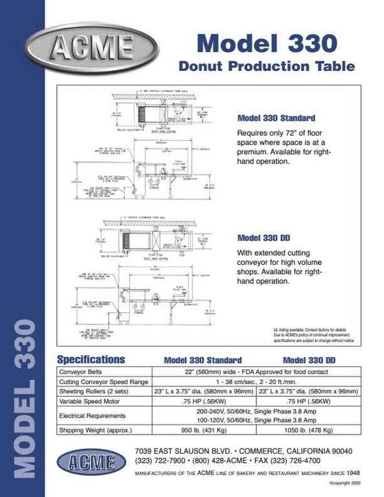 The Model 330 Donut Production Table only requires 72" floor space. This space saving design provides many options for operator floor plan design. The donut production table eliminates slow and ununiform production of hand cut donuts. The 330D quickly pays for itself due to the reduction of labor cost when utilizing the quick and simple sheeting and cutting process of the ACME 330D.The 330D model is made in both Left to Right and Right to Left operation.