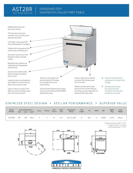 Speed up efficiency on your prep line with this Arctic Air AST28R 29" prep refrigerator! This unit boasts a full length, 11 1/2" deep cutting board for slicing up toppings and assembling all your signature sandwiches and salads, and for added convenience it's top holds up to eight 1/6 size food pans (included) so you can keep your most-used ingredients handy at all times. Below the prep area, a refrigerated cabinet gives you plenty of space to store additional toppings, condiments, and other items, and the self-closing door comes with a stay open feature when opened past 90 degrees.