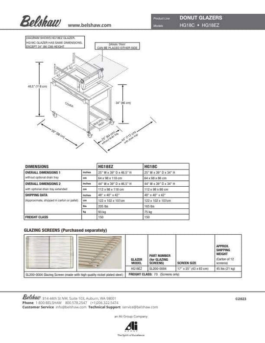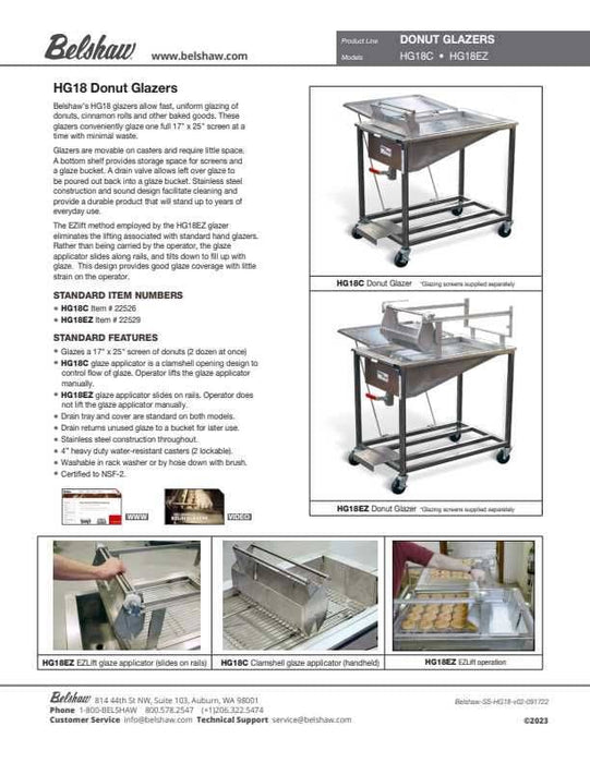 - Belshaw-Adamatic's HG18C Glazer allows fast, uniform glazing of donuts, cinnamon rolls, cakes and other baked goods. It conveniently glazes one full screen at a time with little or no wasted glaze. It is compatible with 17 x 25 inch glaze screens.