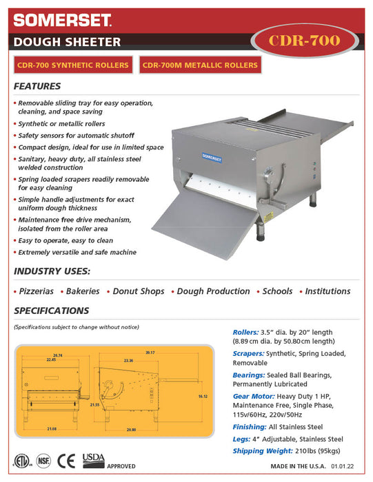 The Somerset CDR-700 is a manual dough sheeter with 3.5" x 20" synthetic rollers. The dough sheeter sheets over 50 lbs of dough up to 20" wide. The dough sheeter is great for pizza production, dough lamination, pastry production and much more!