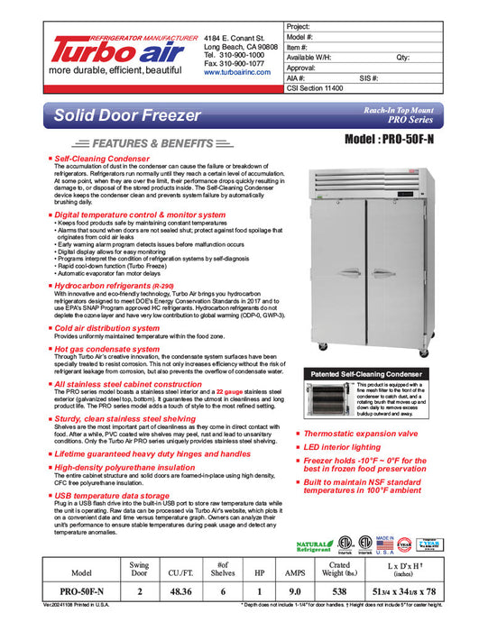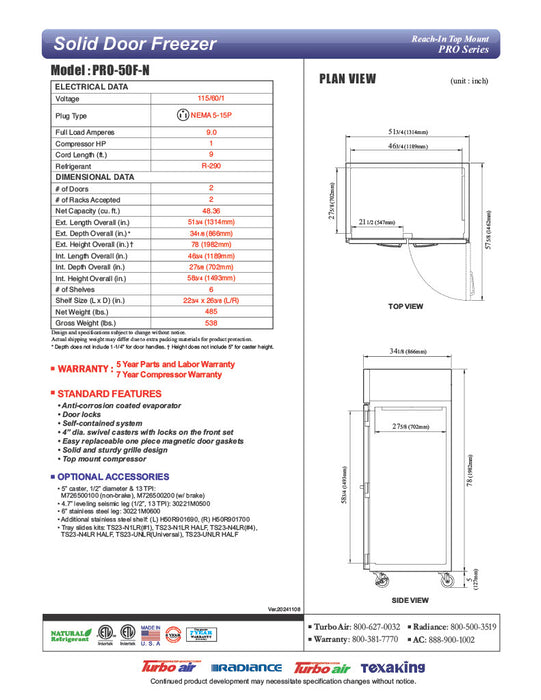 Turbo Air PRO-50F-N 52" Premiere Pro Series Solid Door Reach in Freezer