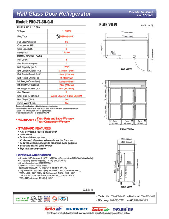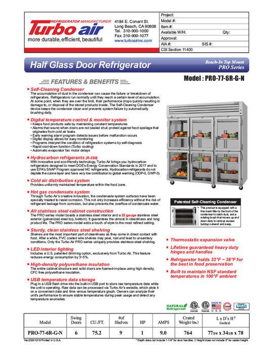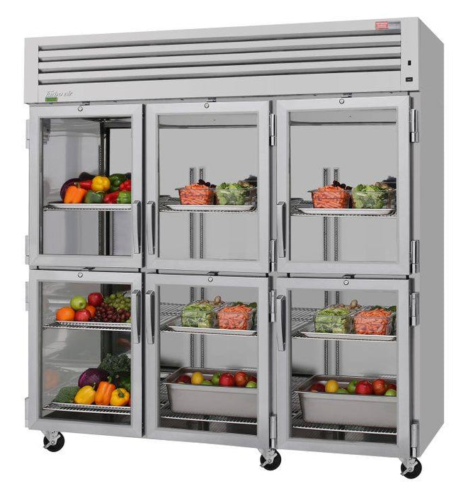 Turbo Air PRO-77-6R-G-N 77 3/4" Three Section Reach In Refrigerator, (6) Left/Right Hinge Glass Doors, 115v