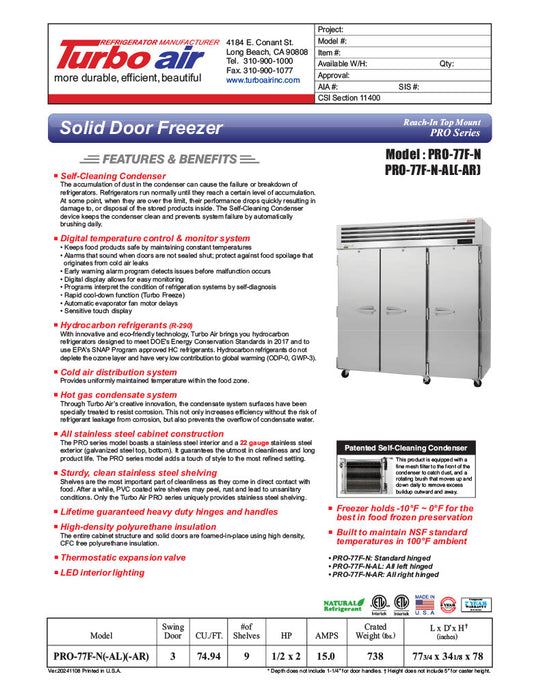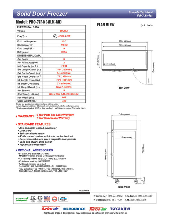 Turbo Air PRO-77F-N 78" Premiere Pro Series Solid Door Reach in Freezer